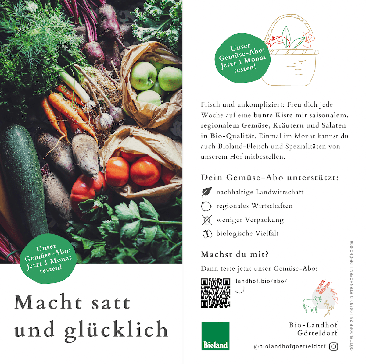 Gemüse, Obst, Fleisch und weitere Bio-Produkte entstehen auf den Weiden, Feldern und in den Gewächshäusern des Bio-Landhof Götteldorf und werden unter anderem als Abokisten in der Region vertrieben. Designerin Maria Seeger und ich gießen die Philosophie des Bio-Betriebs 2023 in ein Corporate Design.