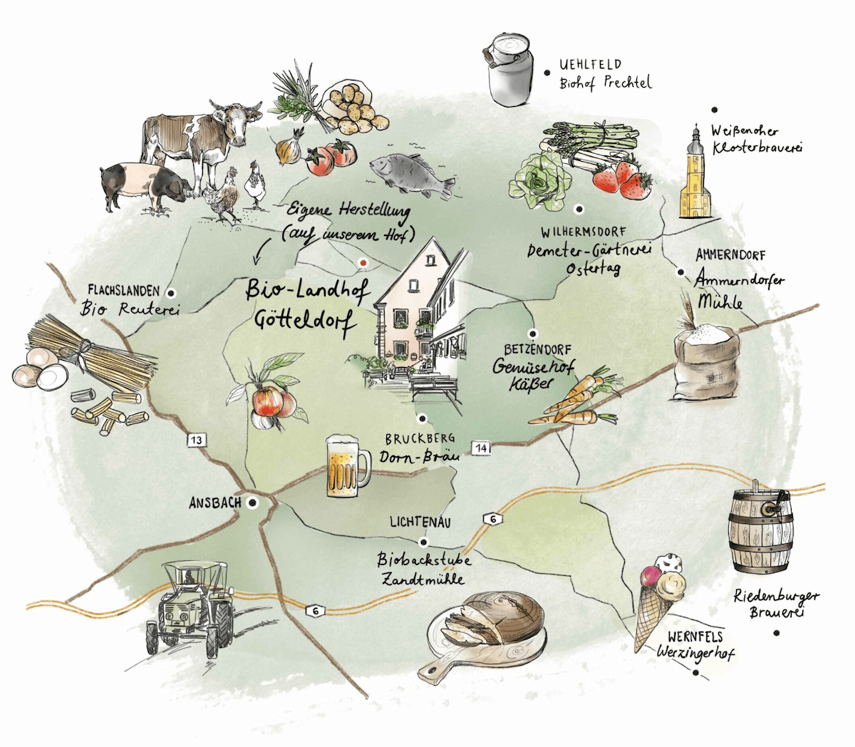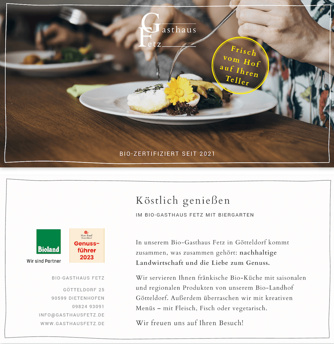 Das Bio-Gasthaus Fetz in Götteldorf ist eine fränkische Gastwirtschaft mit eigenem Bio-Landhof – wunderschön gelegen im Naturpark Frankenhöhe. Mit modernem Konzept, neuen Gasträumen und der Umstellung auf Bioland bringt Inhaber Johannes Fetz das Familienunternehmen seit 2016 auf Zukunftskurs.