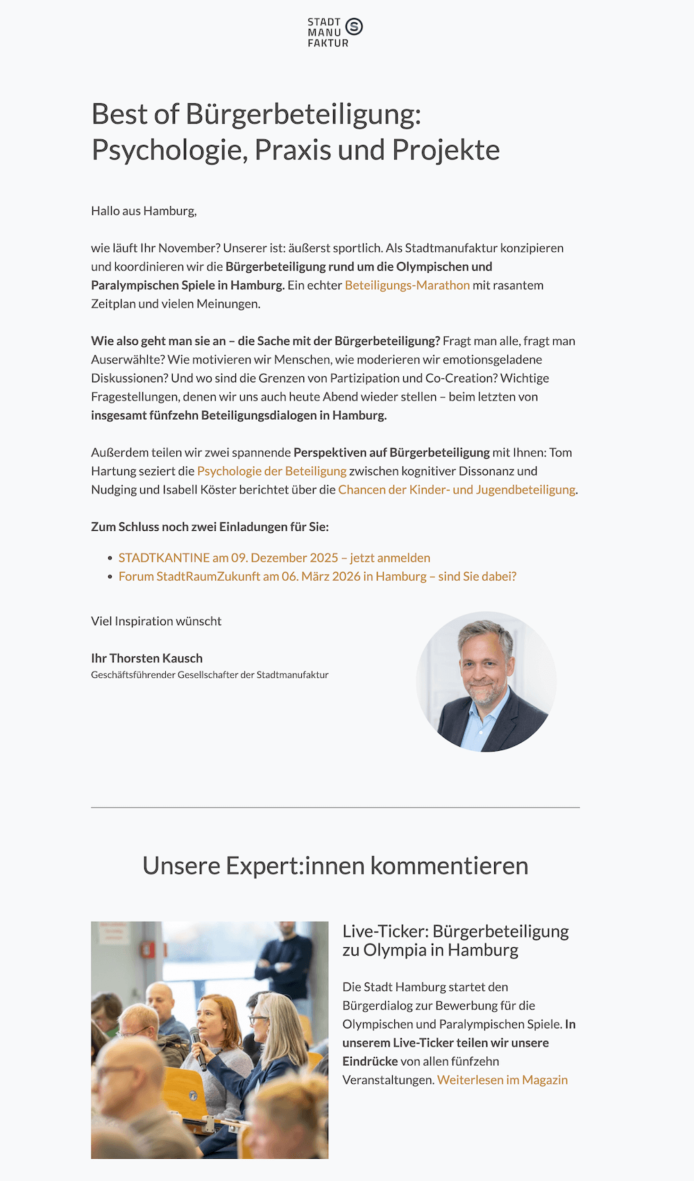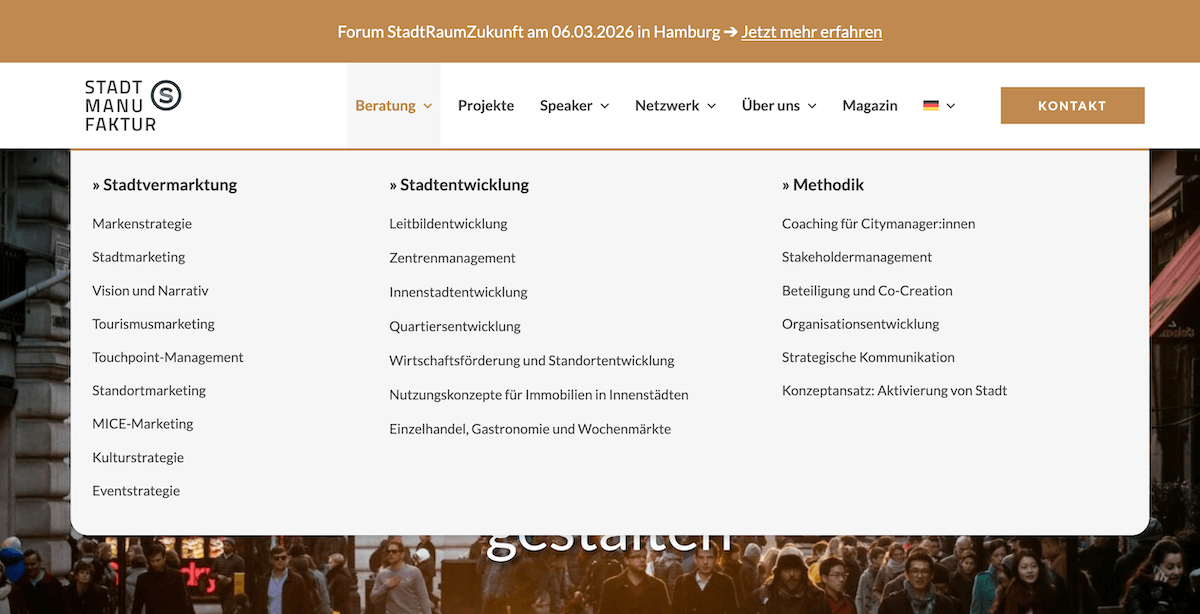 Die Stadtmanufaktur ist eine Strategieberatung aus Hamburg, die Städte, Kommunen und Unternehmen in der Stadtvermarktung und Stadtentwicklung berät. Ich bin ein festes Mitglied im Team um Geschäftsführer und Gründer Thorsten Kausch.