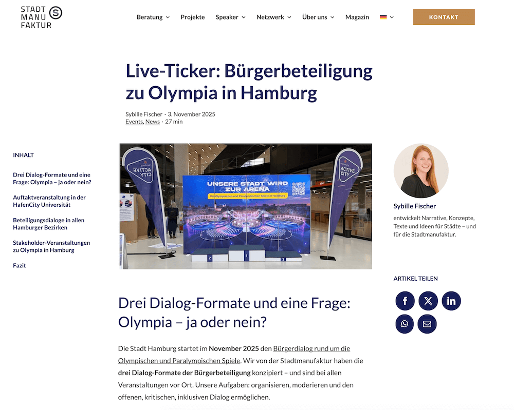 Außerdem bin ich in Projekten der Stadtmanufaktur für Städte in der DACH-Region im Einsatz. Drei Beispiele: Für Reutlingen habe ich ein emotionsstarkes Narrativ entwickelt, für die Innsbruck Marketing GmbH eine Website konzipiert und die Bürgerbeteiligung zu Olympia in Hamburg unterstützt.