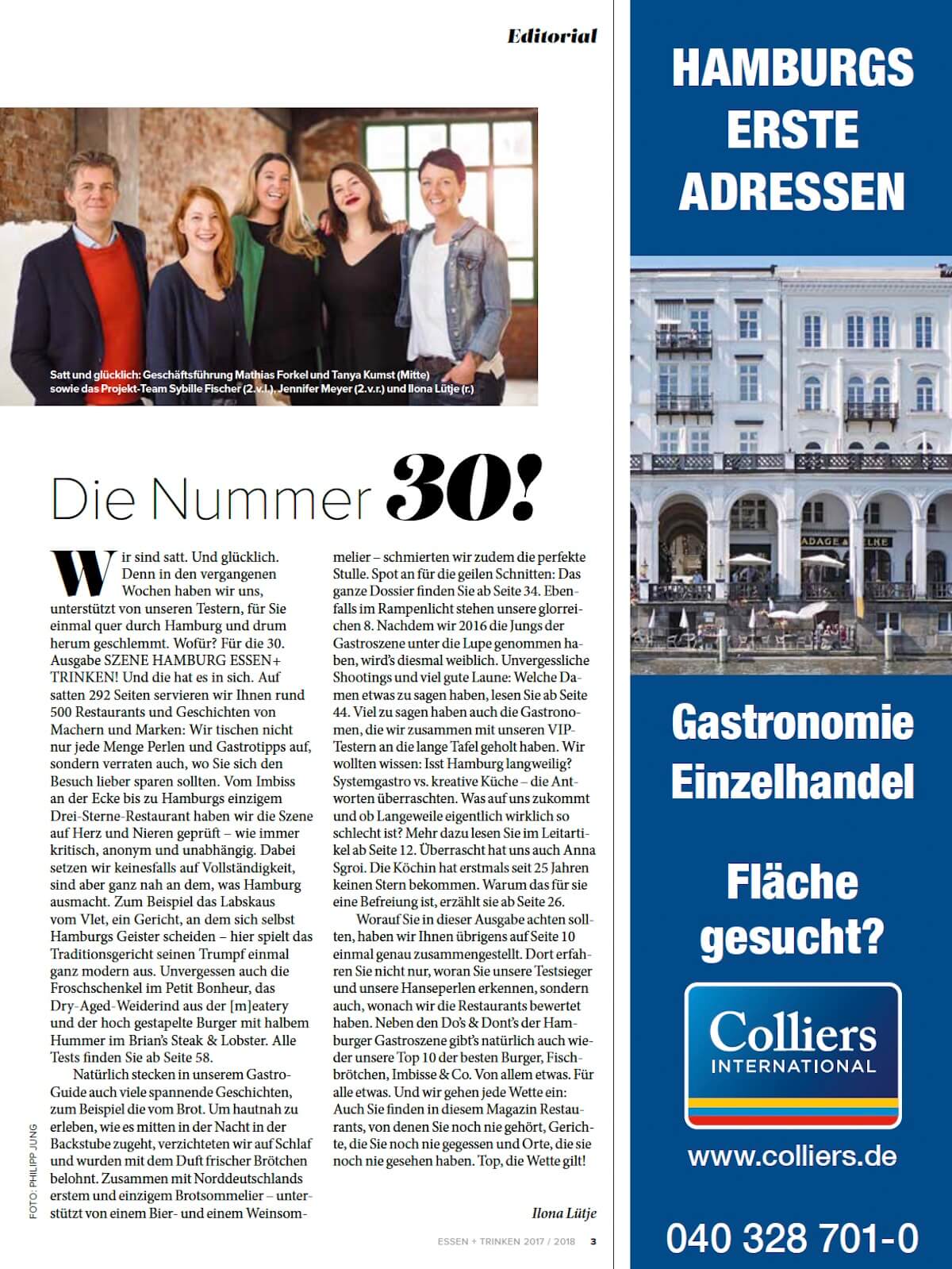 Die SZENE HAMBURG ist Hamburgs ältestes Stadtmagazin und berichtet monatlich in der Print-Ausgabe sowie täglich online auf szene-hamburg.com über das Stadtgeschehen in der Hansestadt. Zudem erscheint einmal im Jahr der wichtigste Restaurantführer für Hamburg: die SZENE HAMBURG ESSEN + TRINKEN.